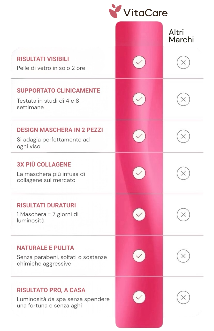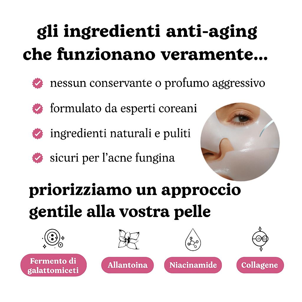 Tutto. Utilizziamo 3 volte più collagene, un design su misura in due parti e una miscela a basso peso molecolare di peptidi e complessi idratanti per risultati visibili e rapidi. Niente appiccicosità, niente trucchi. Solo vera luminosità.