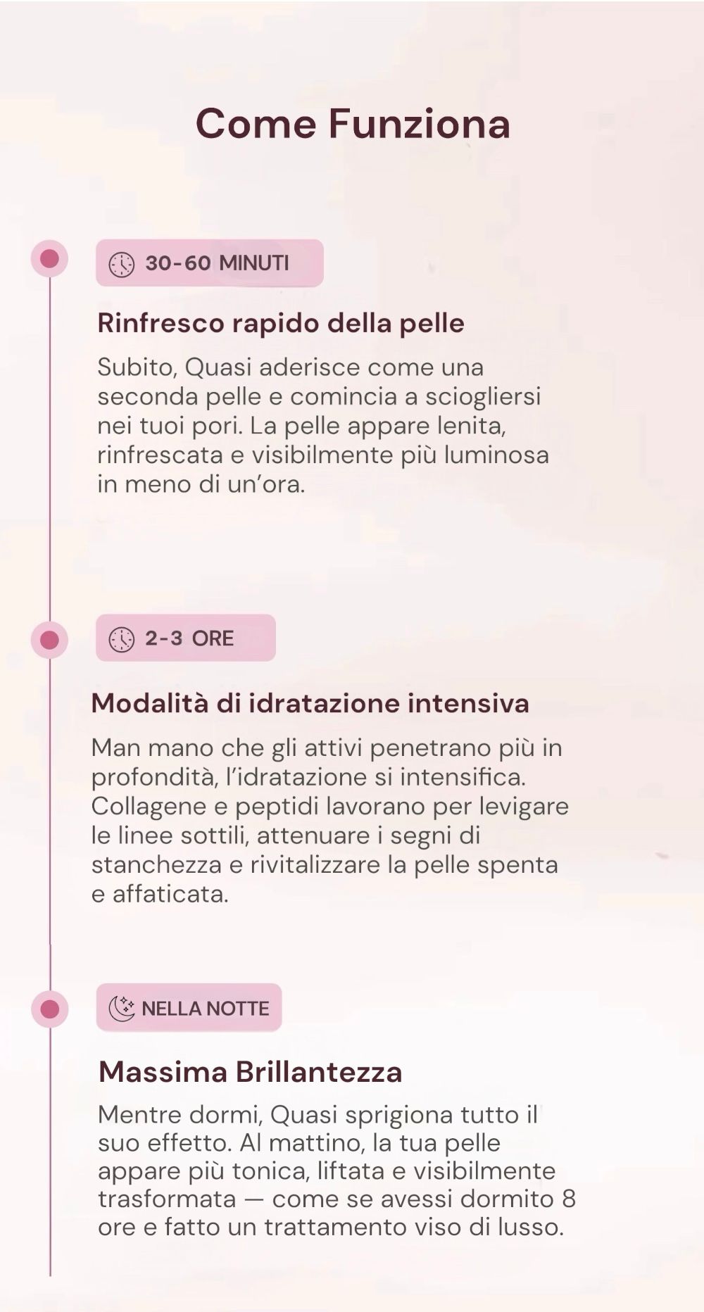 Per risultati duraturi, consigliamo 1-2 volte alla settimana. Per eventi speciali o servizi fotografici, è possibile utilizzarlo anche la sera prima per ottenere il massimo splendore.